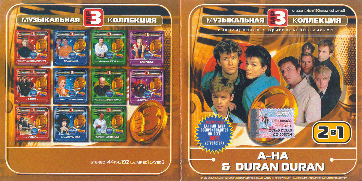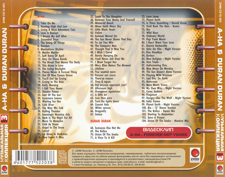 Год выпуска не указан, однако примерное время выпуска диска 10 ноября 2003 года. В копирайте есть адрес www.zhmi.ru, хотя такого сайта вроде бы не существует и вовсе. Внутри буклета содержатся краткие биографии обоих групп с фотографиями некоторых альбомов. МУЗЫКАЛЬНАЯ MP3 КОЛЛЕКЦИЯ A-HA & DURAN DURAN 2 в 1 1. A-HA - Take On Me [3:49] 2. A-HA - Hunting High And Low [3:45] 3. A-HA - Living A Boys Adventure Tale [5:02] 4. A-HA - Love Is Reason [3:07] 5. A-HA - I Dream My Self Alive [3:10] 6. A-HA - Scoundrel Days [4:02] 7. A-HA - The Swing Of Things [4:14] 8. A-HA - October [3:55] 9. A-HA - Manhattanv Skyline [4:52] 10. A-HA - Maybe Maybe [2:36] 11. A-HA - Soft Rains Of April [3:12] 12. A-HA - Stay On These Roads [4:45] 13. A-HA - The Blood That Moves The Body [4:06] 14. A-HA - This Alone Is Love [5:15] 15. A-HA - The Living Daylights [4:47] 16. A-HA - Theres Never A Forever Thing [2:51] 17. A-HA - Out Of Blue Comes Green [6:42] 18. A-HA - You'll End Up Crying [2:07] 19. A-HA - Crying In The Rain [4:25] 20. A-HA - Early Morning [2:58] 21. A-HA - I Call Your Name [4:54] 22. A-HA - Slender Frame [3:42] 23. A-HA - East Of The Sun [4:47] 24. A-HA - Sycamore Leaves [5:21] 25. A-HA - Waiting For Her [4:49] 26. A-HA - Cold River [4:41] 27. A-HA - The Way We Talk [1:31] 28. A-HA - Rolling Thunder [5:43] 29. A-HA - Seemingly Nonstop July [2:54] 30. A-HA - Dark Is The Night For All [3:46] 31. A-HA - Move To Memphis [4:22] 32. A-HA - Cold As Stone [8:19] 33. A-HA - Angel In The Snow [4:13] 34. A-HA - Locust [5:08] 35. A-HA - Lie Down In Darkness [4:31] 36. A-HA - How Sweet It Was [6:02] 37. A-HA - Lamb To The Slaughter [4:20] 38. A-HA - Between Your Mama And Yourself [4:15] 39. A-HA - Memorial Beach [4:36] 40. A-HA - Minor Earth Major Sky [5:23] 41. A-HA - Little Black Heart [4:36] 42. A-HA - Velvet [4:19] 43. A-HA - Summer Moved On [4:37] 44. A-HA - The Sun Never Shone That Day [4:38] 45. A-HA - To Let You Win [4:23] 46. A-HA - The Company Man [3:14] 47. A-HA - Thought That It Was You [3:49] 48. A-HA - I Wish I Cared [4:21] 49. A-HA - Barely Hanging On [3:55] 50. A-HA - Youll Never Get Over Me [5:38] 51. A-HA - I Wont Forget Her [4:43] 52. A-HA - Mary Ellen Makes The Moment [4:53] 53. A-HA - Lifelines [4:17] 54. A-HA - You wanted more [3:40] 55. A-HA - Forever not yours [4:06] 56. A-HA - There'sa reason [4:21] 57. A-HA - Time & agoin [5:03] 58. A-HA - Did anyone approach you? [4:10] 59. A-HA - Afternoon high [4:30] 60. A-HA - Orangeson appletrees [4:16] 61. A-HA - A little bit [4:10] 62. A-HA - Less then pure [4:13] 63. A-HA - Turn the lights down [4:14] 64. A-HA - Cannot hide [3:19] 65. A-HA - White canvas [3:27] 66. A-HA - Dragonfly [3:19] 67. A-HA - Solace [4:20] 68. Duran Duran - Someone Else Not Me [4:50] 69. Duran Duran - The Reflex [4:24] 70. Duran Duran - Union Of The Snake [4:22] 71. Duran Duran - A View To A Kill [3:34] 72. Duran Duran - Lava Lamp [3:54] 73. Duran Duran - Planet Earth [3:57] 74. Duran Duran - Is There Something I Should Know [6:42] 75. Duran Duran - Hold Back The Rain [Remix] [7:02] 76. Duran Duran - Rio [4:45] 77. Duran Duran - Wild Boys [4:17] 78. Duran Duran - Ordinary World [4:42] 79. Duran Duran - Pop Trash Movie [4:55] 80. Duran Duran - I Don't Want Your Love [3:48] 81. Duran Duran - Electric Barbarella [4:17] 82. Duran Duran - Girls On Film [Night Version] [5:29] 83. Duran Duran - Kiss Goodbye [0:41] 84. Duran Duran - Serious [3:56] 85. Duran Duran - New Religion [Night Version] [5:16] 86. Duran Duran - Skin Trade [4:26] 87. Duran Duran - Hallucinating Elvis [3:52] 88. Duran Duran - New Moon On Monday [3:50] 89. Duran Duran - The Sun Doesn't Shine Forever [4:51] 90. Duran Duran - Playing With Uranium [3:51] 91. Duran Duran - Last Day On Earth [4:27] 92. Duran Duran - Notorious [4:00] 93. Duran Duran - Mars Meets Venus [3:08] 94. Duran Duran - My Own Way [Night Version] [6:36] 95. Duran Duran - Come Undone [4:15] 96. Duran Duran - Fragment [0:49] 97. Duran Duran - Hungry Like The Wolf [Night Version] [5:16] 98. Duran Duran - Lady Xanax [4:55] 99. Duran Duran - Planet Earth [Night Version] [6:18] 100. Duran Duran - Rio [12'' Dance Version] [6:44] 101. Duran Duran - The Reflex [Dance Mix] [6:36] 102. Duran Duran - Starting To Remember [2:38] 103. Duran Duran - Save A Prayer [3:47] 104. Duran Duran - Union Of The Snake [Monkey Mix] [6:25] [+] BONUSVIDEO: A-HA - Forever Not Yours [3:56] 656.526.821 байт [+] 47.316.992 байт 7 часов 35 минут 3 секунды 192 kbps 44kHz Stereo (с) "ZHMI Records" (p) "ZHMI Records" |