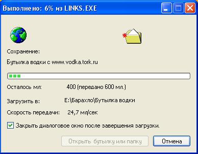 Давай, я тебе водочки со СНИКЕРСОМ по e-mail пошлю! Будет вот так выглядеть (а сначала вопрос: что сделать с с бутылкой: открыть/сохранить/отменить): Сообщение отредактировал Valhalla - 23/12.2005 - 23:24 Эскизы прикрепленных изображений |