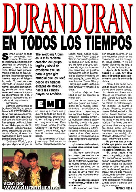 с твоего разрешения закидываю перевод ещё одной статьи-единственное, что меня удивило в ней, так это почему в 93 году написали про турне начиная с холодной Москвы........ 93 г. ДЮРАН ДЮРАН НА ВСЕ ВРЕМЕНА Саймон Лебон это персонаж, который всегда удивляет. Он один тех, кто полностью посвящает себя работе, забывая про отдых. На каждый вопрос Саймон всегда вежливо отвечает. И почти всегда по одной и той же схеме: внимательно слушает, слегка иронично улыбается, слегка прищуривает глаза, отвечает прямо, без увёрток и бурного проявления эмоций. Последний диск Дюран Дюран называется The Wedding Album, что заставило их совершить огромное мировое турне, начиная с холодной Москвы и заканчивая горячими пляжами Рио. "Ordinary World", например, первый сингл с нового альбома, это песня, которая потрясает, которая уже имеет успех у радиослушателей и телезрителей. Также есть и другие темы (Come Undone и Too Much Information), которые также достойны внимания. В данной работе дюранов уже чувствуется профессионализм. К работе над альбомом были привлечены Милтон Насименто, Тэсса Ньес и Ламия. "То, что больше всего мне нравится это полностью погрузиться в музыку - слушать, писать, петь её...., чувствовать, как ты пропитываешься звуками - объясняет Саймон. Музыка для меня также важна как кекс и семья - самые главные радости в жизни. И естественно кекс и семья для меня также являются музыкой. После пяти лет супружества, кекс это уже больше, чем некий физический процесс: это уже выражение любви". - Вы действительно так чувствуете и думаете? Или это просто у вас такая манера разговаривать? - Всё это чистая правда! Одна из вещей, которые я не люблю делать в этой жизни, так это находиться вдалеке от своей семьи. Это у меня вызывает сильный страх. Я ненавижу путешествовать без своей семьи. Бывает даже что я думаю, если мне предстоит умереть, я бы хотел, чтобы мы умерли вместе". - Для тебя кекс это уже одержимость? Какие у тебя сексуальные фантазии? - Оказаться в шикарном особняке, где было бы полно женщин везде, во всех комнатах и во главе всех я. И я перехожу постепенно от одной к другой. Это совершенная безумная фантазия. - Кроме семьи, музыки и кекса есть другие вещи, которые тебя интересуют? Например, живопись? - Конечно. В последнее время у меня появилась страсть к чтению. Один из моих любимых писателей - американский писатель Габриель Гарсиа Маркес. Его книга "Любовь во времена холеры" это гениальное произведение. Что касается живописи, то особенно мне нравятся произведения Пикассо. Из классиков - Рафаэль. Также мне нравится Тумер. Но естественно больше всего меня привлекает музыка. И что касается музыки, то здесь мне надо еще "отдать столько долгов", чтобы добиться того, чего добились например, Prince, John Lee Hooker (который играет на гитаре лучше, чем кто-либо другой), Jim Morrison, Cocteau Twins, и Patti Smith. - Тебе не кажется, что для некоторых из этих исполнителей, которых ты перечислил, смыслом жизни являлись материальные блага? Как ты считаешь? - Да, ты прав. И это мне не нравится, например, быть слишком зависимым от материальных вещей, потому что всё это ты можешь потерять или это могу у тебя украсть, а ведь всё это не имеет души, всё это недолговечно. Я предпочитаю более насущные и чувственные вещи, как, например, провести вечер с семьей или встретить вместе утро, приготовить обед вместе с женой, затем пойти повеселиться с друзьями. Эскиз