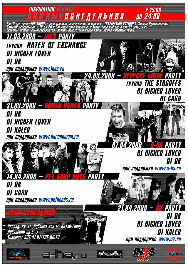 Недавно с нами на связь вышел представитель клуба The Tunnel. Привожу его сообщение: Цитата Добрый день! Клуб-бар туннель (м. Лубянка) с марта меняет концепцию вечеринок по понедельникам, то есть теперь каждый понедельник будет посвящен определенной группе . Один из понедельников мы хотели посветить группе Duran Duran. Начало в 19.00, окончание в 00.00. В 21.00 видео показ концерта До и после играет dj в концепции данного мероприятия. Вход бесплатный. На повестке дня две даты - 31 марта (что связано с некоторыми нюансами - как то - возможное отсутствие вышедшего на контакт представителя клуба на месте) и 14 апреля. Далее: 1 - Мы сами создаём трек-лист для dj, или он "играет" сам на своё усмотрение, как было сказано, "в концепции данного мероприятия". (Если найдётся инициативная группа для составления трек-листа - буду благодарна за помошь.) 2 - Мы решаем, какой концерт хотим смотреть. И вообще... любые предложения по форме проведения мероприятия приветствуются!!! С датой нужно определиться до конца этой недели, так что... Вперёд!!!!!!!!!!!!!!!!!!!! |