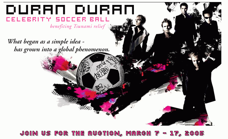 ЦИТАТА In 2004, Duran Duran attended the MTV Europe Music Awards in Rome and began collecting celebrity signatures on a soccer ball. Duran Duran founding member, Nick Rhodes, led the celebrity signature drive, believing the soccer ball would make a great auction item – with proceeds to benefit charity. After seeing the devastation created by the Tsunami in South Asia, the band agreed to redouble their efforts and eventually auction the ball to benefit a charity involved in Tsunami relief. All proceeds from the celebrity signed soccer ball will benefit GlobalGiving, a charitable organization which focuses on grassroots and project-based relief efforts in areas affected by the Tsunami. The soccer ball made its first public appearance on National English TV in January 2005. After crossing the pond, gathering signatures along the way, the ball made its final showing on February 1, 2005 on Good Morning America. During the Good Morning America segment, the band announced their plan to auction the ball on eBay March 7, 2005. • Duran Duran (all members) • Pharrell and Chad (NERD) • Anastasia • Andre 3000 (OutKast) • Apl.de.Ap (Black Eyed Peas) • Alex Kapranos (Franz Ferdinand) • Robert Smith (The Cure) • Gwen Stefani • Sharon & Ozzy Osbourne • Maroon 5 (all members) • Jamelia • Alicia Keyes • Swifty (D12) • MCA (Beastie Boys) • Naomi Campbell • Cate Blanchett • Kany West • Lamar • Tracey Emin A complete list of celebrity signatures will be available on March 7, 2005. |