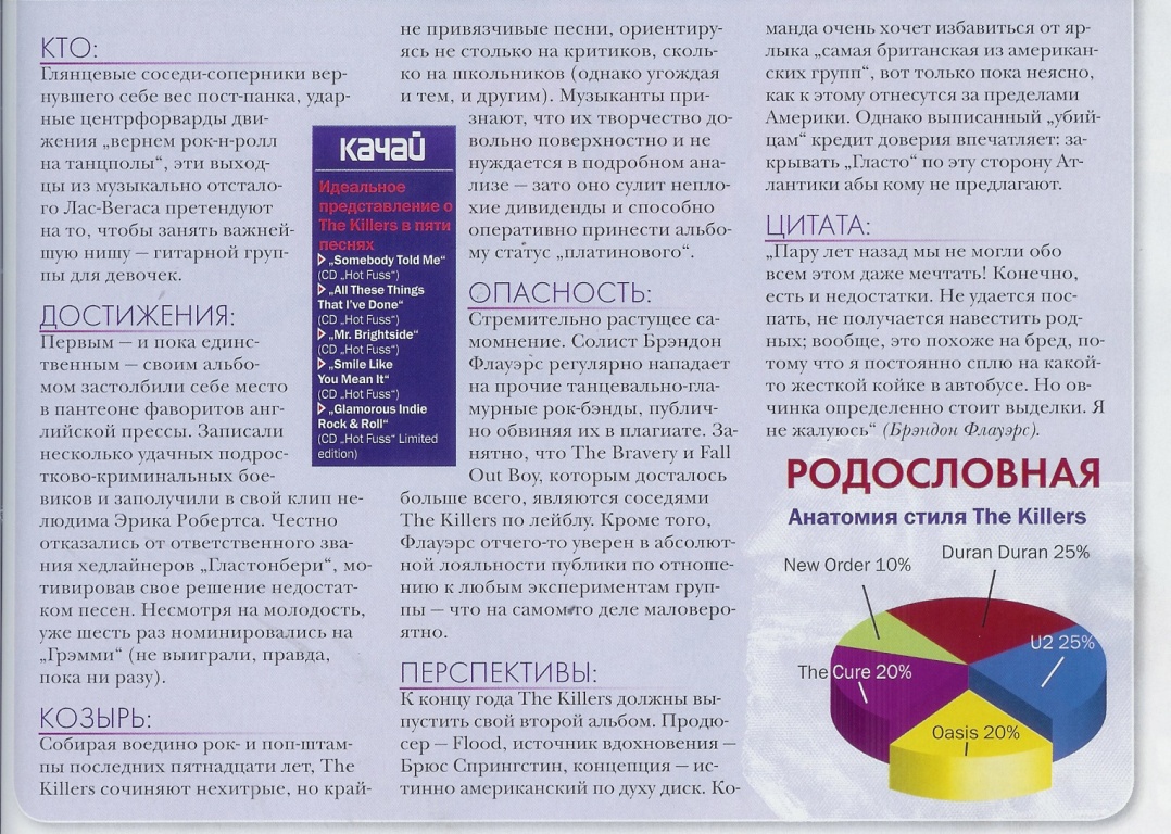по мнению этого журнала "киллеры" очень много унаследовали от дюранов..... да и солист Брэндон Флауэрс неоднократно повторял, что DD одна из лучших групп , и что ей стоит подражать... обратите внимание на так называемую родословную.... Эскизы прикрепленных изображений |