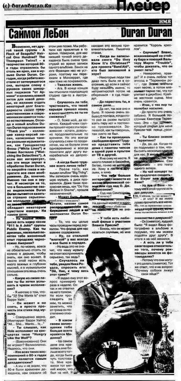 Тем не менее, в 1985 году они выпускают последний альбом группы в этом составе под названием 'Arcadia', который еще более усугубляет положение. После его выпуска Саймон и Ник уходят из группы и вообще покидают Англию, улетают в Париж. 'Нам необходимо было уехать оттуда, бросить все и излечиться от этого сумасшествия. Париж стал нашим вторым домом и смена обстановки очень помогла...' - говорит Ник. Тем временем Джон и Энди записывают диск 'The Power Station' в стиле рок, который остается незамеченным ни критиками, ни поклонниками. Группа распадается полностью. А в конце 1986 года Ник и Саймон возвращаются домой. В 1987 году Ник, Джон и Саймон принимают решение возродить группу, но при условии, что это будет совсем другой Duran Duran. Энди и Роджер отказываются работать с ними и в итоге в 1987 году те трое записывают 'Notorious' ('Пресловутый'). Во время записи этого альбома все понимали, что 'Notorious' не будет пользоваться большой славой из-за ухода двух членов группы; к тому же он был написан в каком-то танцевальном стиле, вообще-то не характерным для них. Но никто не ожидал такого провала. Альбом почти не покупали. Не сломленные духом, Ник, Джон и Саймон делают 'Big Thing', который постигает примерно такая же учесть. Но Дюрановцы не сдаются! В 1988 году они принимают в свою 'банду' четвертого - гитариста Уоррена Кукуруллу и теперь уже впятером (включая драматурга) записывают альбом 1990 года 'Liberty'. Этот альбом сильно отличается от всех предыдущих своей музыкальностью, мелодичностью. На мой взгляд, практически все композиции оттуда заслуживают большого внимания поклонников этой группы и просто любителей музыки, хотя сами члены Duran Duran считают его 'слабым'. Тем не менее, с этим альбомом к ним снова приходит известность, хотя ее еще нельзя сравнить с прежней славой.