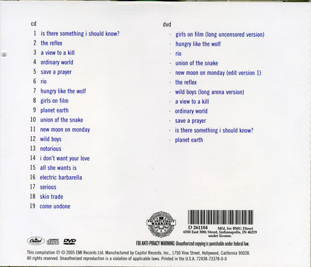 Прикупил я тут на днях в инет-магазине неприятно недешевый двойничок Greatest cd+dvd, производства вроде как EMI/Capitol Records, USA, 2005, (72438-73378-0-0) запечатанный, ессесьна... Но вот когда я его расковырял, закрались в мою душу смутные сомнения - а не продали ли мне неправду какуй-ньть? С содержанием-то все в порядке, а вот оформление зело смущает. Хотя, конечно, америкосные диски в смысле полиграфии зачастую бывают и похуже некоторых пиратских, но тут...вообще как-то угрюмо все. Может кто-нибудь меня просветит? Надули дядю, или все нормално?